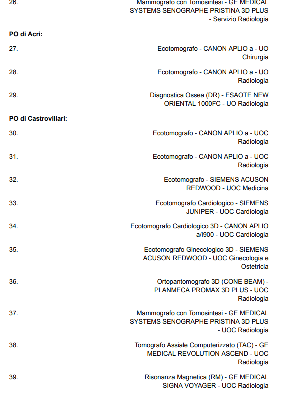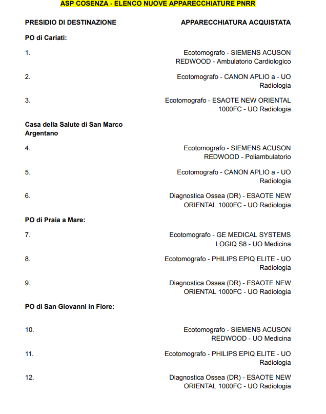 L’elenco delle strumentazioni acquisite – aggiunge – che spazia dalle ecografie di ultima generazione alle risonanze magnetiche, dalle TAC ai mammografi digitali con tomosintesi, evidenzia una strategia mirata a rafforzare in maniera significativa sia la sanità territoriale che i presidi ospedalieri esistenti nell’intera provincia di Cosenza.