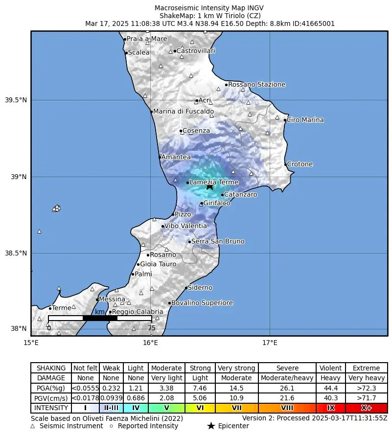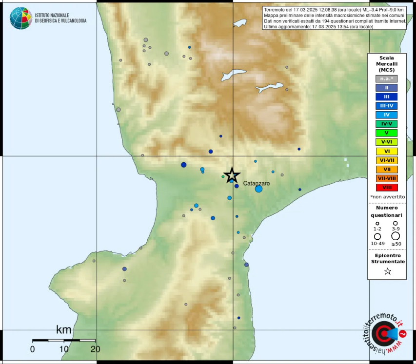 Un’analisi di quanto sta accadendo al centro della Calabria è stato realizzato dall’iNGV che ha localizzato 134 terremoti nell’area compresa fra Marcellinara – Miglierina – Tiriolo con profondità ipocentrali comprese fra 5 e 13 km. Di questi: 102 eventi hanno avuto magnitudo minore di 2.0, 30 magnitudo compresa tra 2.0 e 3.0 e 2 con magnitudo comprese tra 3.0 e 4.0, con l’evento di massima magnitudo pari a 3.4 avvenuto alle oggi alle ore 12:08 italiane.