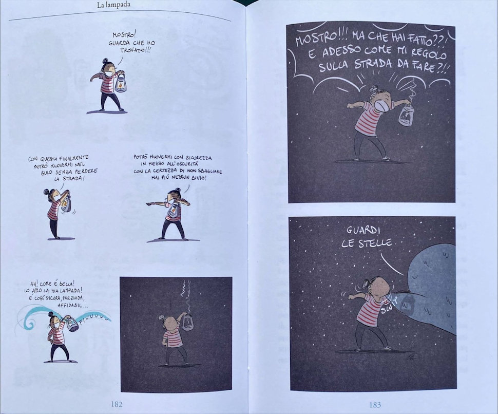 L’ambientazione in natura è un elemento ricorrente e significativo nel libro, come sottolinea Rossana Castriota, che richiama il nostro bisogno di riconnetterci con i ritmi naturali e una dimensione più umana e vivibile. Un esempio è la metafora delle stelle riportata nella striscia della “Lampada”, in cui il mostro ci suggerisce che nel momento in cui la nostra “luce” si spegne e ci ritroviamo immersi in un buio esistenziale, proprio allora possiamo iniziare a scorgere le “stelle”, piccole, luminose verità che si rivelano solo nell’oscurità, le stelle come “segnaletica superiore, universale”, sottolinea l’autrice.