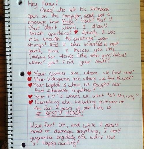 Nella lettera la ragazza racconta all’ormai ex di essere entrata nel suo account Facebook e di aver letto un messaggio ricevuto da un’altra ragazza, chiamata Kelsi.