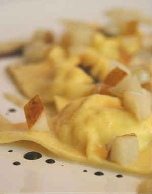 PREPARAZIONE Mettere in una terrina il taleggio tagliato a cubetti piccoli, la crescenza, i caprini, 50 g di parmigiano e due uova. Condire con sale e pepe e lavorare il tutto con una forchetta fino ad ottenere un composto omogeneo. Conservare il composto in frigorifero. Mettere la farina sul piano da lavoro e fare la fonte, sgusciarvi 4 uova, aggiungere un po’ di sale e lavorare con le mani aggiungendo l’acqua che occorre per ottenere un impasto liscio e sodo. Dividere la pasta in due parti uguali e stenderle con il matterello ottenendo due rettangoli della stessa grandezza e sottili. Deporre su una delle due sfoglie mucchietti di ripieno distanziandoli poi ricoprire con la seconda di sfoglia di pasta e con le dita premere bene intorno ai solchi lasciati dal ripieno. Con una rotella tagliapasta dentata formare i ravioli di forma quadrata e lessarli in una pentola con abbondante acqua bollente salata. Mettere in una padella 50 g di burro e farlo fondere, aggiungere il prosciutto tagliato a pezzettini, lasciarlo insaporire poi aggiungere la fontina a pezzettini e la panna , condire con sale e pepe e lasciare sul fuoco basso fino ad ottenere una salsina cremosa. Mettere i ravioli in una zuppiera, condirli con la salsina preparata e il parmigiano rimasto.