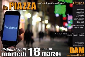 Attraverso le piattaforme virtuali si è tutti amici. Si eliminano i convenevoli, si annullano le distanze, formali, sociali e anagrafiche e ci si sente liberi di confrontarsi con gli altri in modo spontaneo e allo stesso tempo, rassicurante. Non è più necessario esporsi “personalmente”, ma si interagisce tramite uno strumento che in qualche modo tutela la propria identità.Ma questo nuovo concetto di piazza può anche amplificare il concetto di solitudine. La mostra cerca di esplicitare com’è cambiato il modo di vivere la “piazza”, come sia in atto un processo di svuotamento della stessa e come la socializzazione si sta velocemente spostando verso luoghi di ritrovo virtuali che diventano sempre più numerosi. A ciascun osservatore è demandato il compito di contestualizzare le fotografie secondo il proprio modo di intendere la “piazza” come luogo fisico e come punto in cui sviluppare la socialità. Le foto sono state realizzate da Alessandra Parisi, Miriam Ientile, Erica Barrese, Maria Crobu, Giovanna Liuzzi, Eleonora Marchione, Alessio Guaglianone, Pietro Tripodi, Paola Varone e Bruno Umbro.