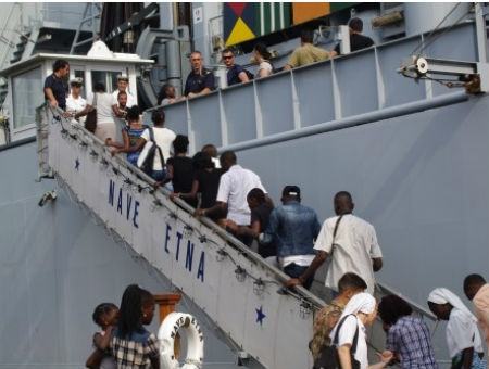La nave in un primo tempo doveva dirigersi a Catania ma successivamente è stata dirottata a Reggio Calabria. Ad attendere i migranti ci sono cinque autobus che li condurranno nelle strutture che dovranno ospitarli. Per organizzare l’accoglienza nella serata di ieri si era riunita l’unità di crisi istituita dal prefetto Claudio Sammartino alla presenza di rappresentanti delle forze di polizia, della Croce rossa, del 118 e della Protezione civile. I migranti sono stati soccorsi ieri dalla nave Etna della Marina militare al largo del Canale di Sicilia e giunti stamane a bordo della stessa unità nel porto di Reggio Calabria. E’ la prima volta che una nave militare impegnata nell’operazione Mare Nostrum fa scalo in Calabria. I migranti di cui 402 uomini, 104 donne e 112 minori stanno complessivamente bene. Due sono i barellati e due sono le donne incinte. C’è anche una persona con un sospetto pregresso infarto che è stata affidata alle cure dei sanitari. Gli immigrati sono di nazionalità somala, siriana, palestinese, marocchina e tunisina. Quindi sia rifugiati politici che persone in cerca di lavoro. A prestare loro le prime cure sono stati i medici dell’ufficio sanitario marittimo, aereo e di frontiera assieme a pediatri volontari. Impegnati anche agenti della polizia municipale e provinciale di Reggio Calabria e della Protezione civile, assieme a carabinieri, polizia e guardia di finanza. Cento saranno i migranti che verranno trasferiti immediatamente nel centro di prima accoglienza di Crotone, mentre i restanti saranno ospitati all’interno di due palestre messe a disposizione dal Comune di Reggio. I medici che li hanno visitati hanno riscontrato casi di scabbia e di pediculosi. Qualcuna delle persone a bordo presenta anche i sintomi della varicella, mentre sono molto diffuse varie forme di dermatite. Le operazioni di identificazione degli immigrati saranno effettuate nel centro di prima accoglienza Sant’Anna di Crotone e nelle due palestre di Reggio Calabria dove saranno ospitati.