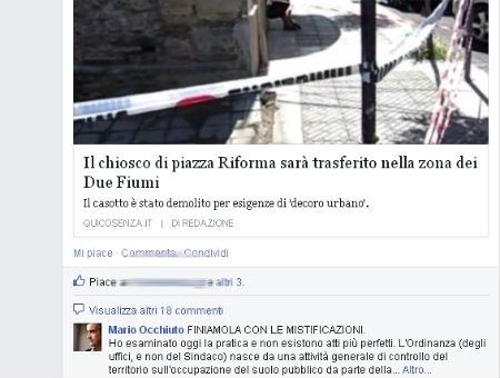 Il chiosco di piazza Riforma. Occhiuto su Facebook: ‘stop alle mistificazioni’