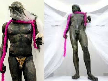 I Bronzi di Riace in tanga o con il velo da sposa, gli scatti di Gerald Bruneau