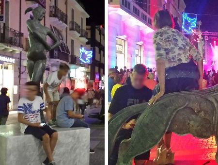Sembra infatti che le statue del Mab posizionate su corso Mazzini, siano utilizzate da alcuni cittadini nei modi più disparati. C’è chi si mette a cavallo del “Lupo della Sila” di Mimmo Rotella per farsi una foto, chi trova comoda la sua base così da sedersi sopra a mò di panchina. E la maggior parte di queste persone, sono adulti. E allora cosa ci si può aspettare dai ragazzi? A pochi passi, tre ragazzini sono seduti sulla base della Bagnante di Emilio Greco. E questo è quanto immortalato solo ieri sera. Cari cittadini, giovani o adulti che siate, le statue non sono panchine ma ‘opere d’arte‘ e in quanto tali vanno rispettate. Di conseguenza si rispetta l’artista, la città e i cosentini. E poi le panchine sulle quali accomodarsi a corso Mazzini sono tantissime…