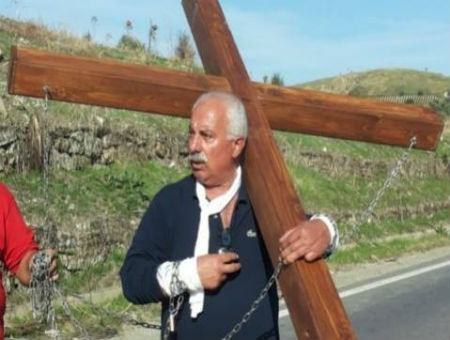 Protesta inscenando una via Crucis sulla ‘statale della morte’ incatenato ad una croce