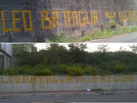 Dalla statale 18 tirrenica alla 107 silana crotonese, fino alla statale 106 jonica…. quella scritta, sempre uguale e ripetitiva, imbratta i muri di mezza provincia di Cosenza e non solo: stiamo parlando di “Leo Battaglia alla Regione”. Contro questo ‘soggetto’ che ha praticamente deturpato una parte della ‘regione’ tanto declamata, è nata addirittura una petizione on-line per far cancellare tutte le iscrizioni, pubblicitarie e abusive, presenti sui muri di gran parte della Calabria se concretamente il ‘candidato’ ha intenzione di ‘dare un segno di civiltà e cambiamento’. Effettivamente è un esempio sì, ma di inciviltà e indecenza. In molti avranno notato la scritta “Leo Battaglia alla Regione” che in un certo senso è riuscita nel suo intento, ovvero quello di farsi notare, ma probabilmente non… di farsi votare. Perché quell’atto ha creato un generale malcontento che ha portato all’avvio non solo di una petizione, ma addirittura di una pagina Facebook denominata “Leo Battaglia deve rimediare allo scempio sui muri”. E non è nata poi molto tempo fa. Al ‘grido’ di “Per chi è stanco dei tanti Leo Battaglia che ad ogni elezione rovinano i muri delle città e delle strade, manifestando il degrado culturale che li ha partoriti“, la pagina è venuta alla luce lo scorso 12 ottobre. Eh si, perchè effettivamente da molto fastidio trovare in ogni angolo di strada, dalla statale che porta a Paola a Rende, dalla 107 che porta in Sila o sulla 106 jonica, quella frase che campeggia con tanto di pittura gialla o bianca. Ma chi è Leo Battaglia? Esiste davvero? E’ vero, vivo e vegeto ed è il presidente del Club Forza Italia Pollino, oltre che candidato della coalizione di centrodestra alla carica di consigliere regionale nell’area del Pollino. Le elezioni sono fissate al prossimo 23 novembre, ma ‘l’imbrattatore’ ha iniziato a dipingere le strade già da qualche mese. Ed è per questo che ci si chiede come sia possibile candidare a rappresentante dei calabresi una persona che, invece di tutelare e salvaguardare il territorio, lo deturpa  e lo sfregia solo per campagna elettorale? Qualche tempo fa, lo stesso Battaglia aveva dichiarato: “gireremo tutto il territorio per farci conoscere e per far conoscere il nostro impegno, sapremo farci apprezzare. I consensi che otterremo saranno la migliore risposta al nostro lavoro”. Forse avrebbe molti più voti di quanto pensa, se iniziasse solo a pulire e cancellare quelle scritte ingombranti e si occupasse realmente del territorio che lui stesso, o chi per lui, sta imbrattando senza ritegno.