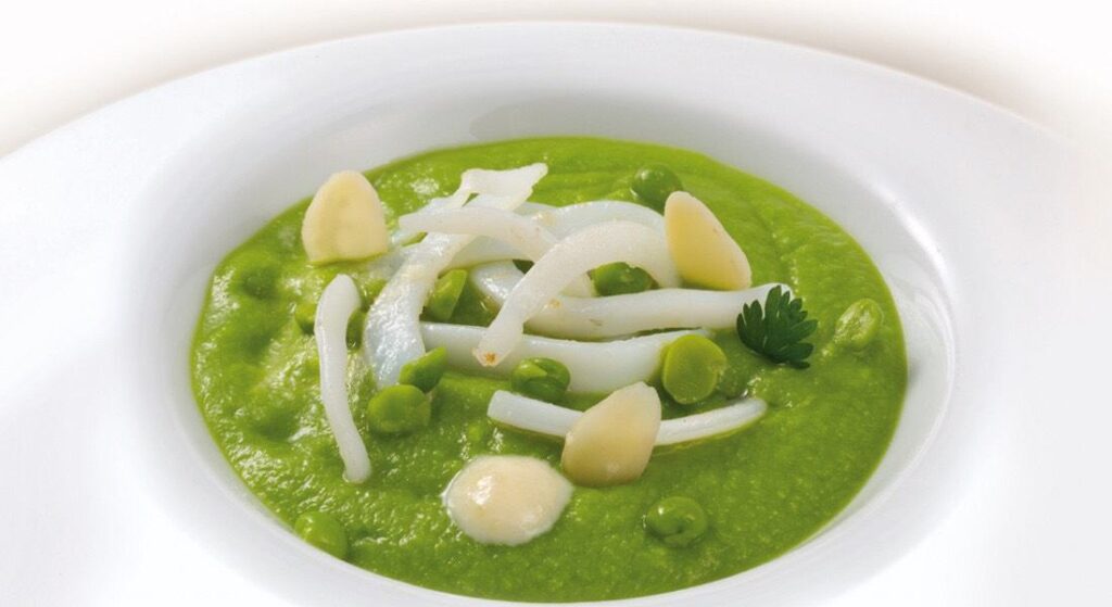 Tagliamo le seppie in strisce sottili, come se fossero degli spaghetti alla chitarra. Nel nel frattempo cuociamo i piselli. Mettiamo in una pentola dell’olio di oliva, le patate tagliate a cubetti, i piselli con la cipolla e facciamo soffriggere il tutto per circa 5 minuti. A questo punto aggiungiamo 500 millilitri di brodo e facciamo cuocere per altri 18/20 minuti a fuoco moderato trascorsi i quali con l’aiuto di un mixer da cucina creeremo una crema compatta. Se dovesse essere necessario aggiungete un po’ di acqua per renderla meno densa. Adesso portiamo ad ebollizione l’acqua con il sale e caliamo la nostra seppia tagliata a strisce per 3/5 minuti in base alla grandezza, arrivati a cottura saltiamole con i piselli e il nostro piatto è pronto per essere gustato.