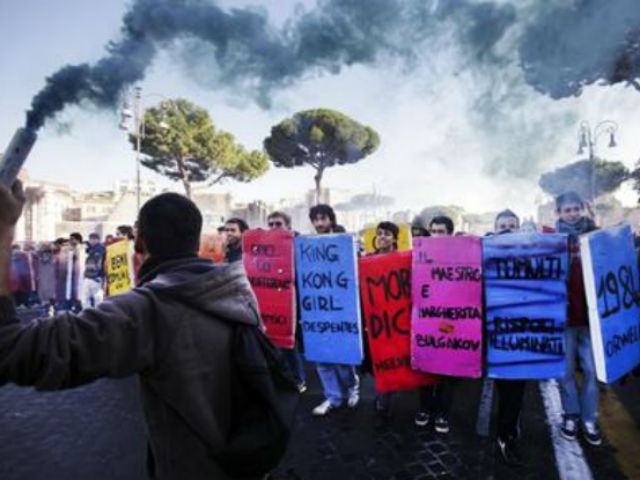 “Oggi protestiamo contro la crisi economica, i tagli previsti dalla spending review e questo Stato che non e’ piu’ democratico ma che e’ diventato una dittatura”. Cosi’ Mario, 16 anni, spiega il motivo per cui e’ sceso oggi in piazza a Roma con altri studenti dei licei romani. Le sue parole sono ampiamente condivise tra i ragazzi del corteo che in questo momento sta attraversando in modo pacifico il ponte fra porto di Ripa Grande e via Marmorata. “Siamo contro questo Governo, che non ci rappresenta, e contro le politiche di austerity che stanno distruggendo il Paese”. Cosi’ Valeria, 17 anni, spiega il motivo per il quale e’ scesa in piazza oggi nella Capitale con migliaia di altri studenti dei licei romani. Un ragazzo quindicenne del liceo “Virgilio” e’ stato fermato dalla polizia in seguito agli scontri avvenuti a Porta Portese alcuni minuti fa. Il giovane e’ stato portato in questura per essere identificato e riaffidato ai genitori in quanto minorenne.E’ di quattro poliziotti feriti, tra cui un funzionario, il bilancio degli scontri avvenuti all’altezza di piazzale Portuense a Roma nel corso del corteo degli studenti. I quattro poliziotti sono stati medicati per leggere contusioni. Gli incidenti si sono verificati quando un gruppo di ragazzi ha tentato di sfondare uno sbarramento di agenti per deviare il percorso e questi ultimi hanno effettuato una carica di ‘contenimento’ dopo che era iniziato un lancio di pietre da parte dei ragazzi. Gli agenti della Digos hanno fermato un quindicenne, gia’ identificato e riaffidato ai genitori, e hanno sequestrato anche due scudi in plexiglass utilizzati dai ragazzi oltre a pietre e bastoni. Momenti di tensione nel corteo degli studenti a Roma che in questo momento sta percorrendo via Marmorata in direzione Piramide: alcuni studenti hanno violentemente contestato una collega giornalista di Mediaset che si trovava in mezzo a loro. I ragazzi l’hanno intimidita dicendole di andar via, di spostarsi dal corteo. In precedenza i giovani avevano urlato: “giornalisti terroristi”.