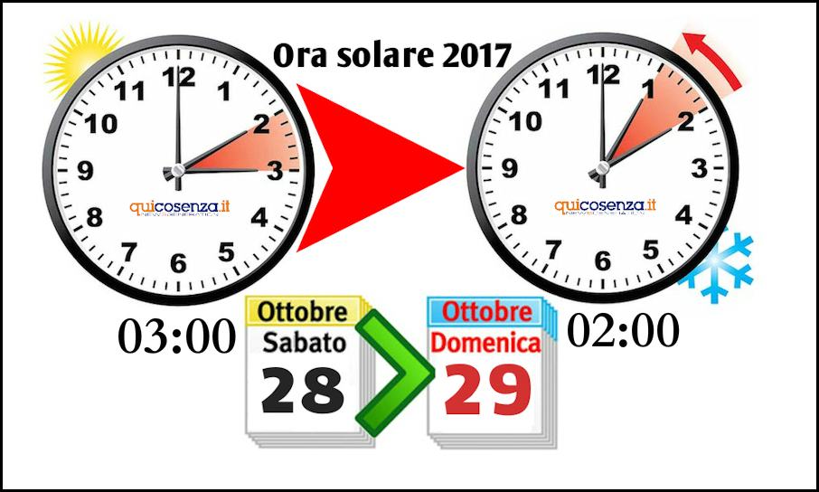 COSENZA – Come ogni anno, con l’ultima domenica di ottobre, siamo pronti a tornare allora solare che ci accompagnerà fino al 25 marzo del 2018. L’entrata in vigore dell’ora “reale”, quella dettata dai ritmi del sole, coincide tradizionalmente con l’arrivo della stagione fredda. Le giornate si accorciano sempre di più e con il cambio di ora farà buio molto prima, mentre all’alba avremo più luce.