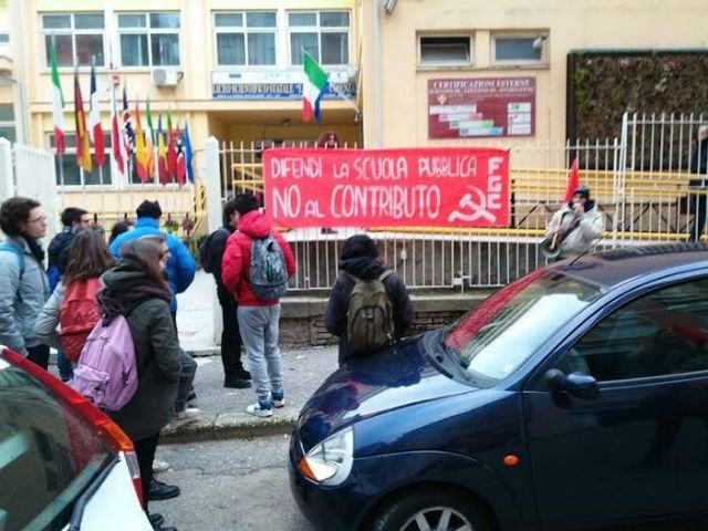 “Difendi la scuola pubblica, blocca il contributo” è lo slogan che ha accolto in queste settimane molti studenti del cosentino. Le azioni di protesta sono state organizzate dai militanti del Fronte della Gioventù Comunista, che hanno presidiato l’ingresso delle varie scuole con striscione e volantini. «Da anni le scuole ci impongono di pagare un contributo economico al momento dell’iscrizione, che anno dopo anno è salito fino all’attuale media nazionale di 150 euro – hanno spiegato i ragazzi del Fronte – . Il risultato è che l’Italia è l’unico paese in cui la scuola si paga due volte, con le tasse e con questa tassa mascherata da contributo “volontario”, sempre più insostenibile per le famiglie. Dal 2008 i governi hanno tagliato alla scuola più di 20 miliardi di euro per provvedimenti favorevoli a banche e grandi imprese. Come conseguenza le famiglie sono state indotte a finanziare progressivamente la scuola di tasca propria, e questa è stata la leva per imporre tagli sempre maggiori.