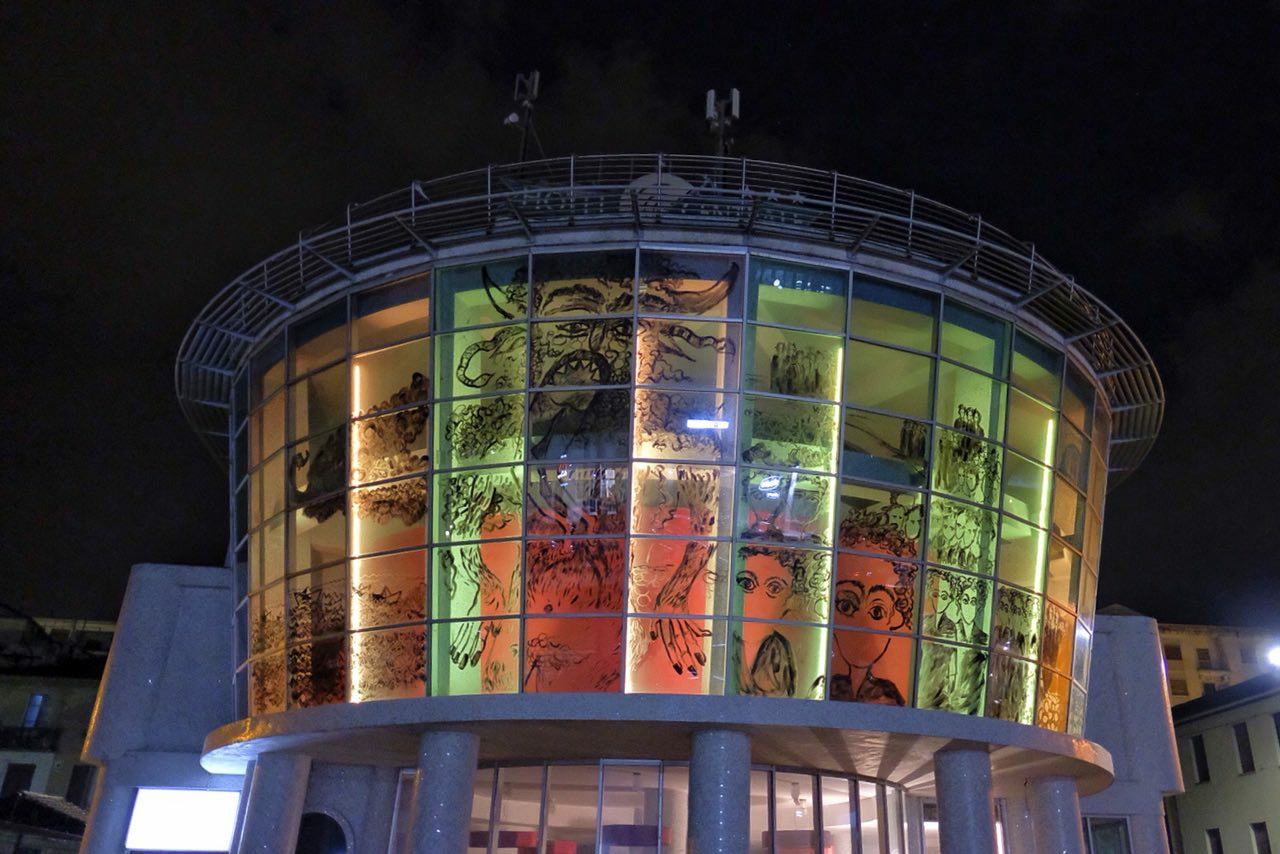 COSENZA – L’ex Hotel Centrale torna ad illuminarsi. Da domenica la navata dell’albergo occupato su Viale Parco è tornata ad adornare la struttura oggi abitata da più di 80 persone. Esodo il nome dell’opera ispirata all’Inferno del Giudizio Universale del pittore fiorentino del 1200 Coppo di Marcovaldo, realizzata dall’artista cosentino Marco Cotroneo. Già autore delle casette del Ponte di Calatrava e della panchina su corso Mazzini, Cotroneo ha inteso sintetizzare nel demone ‘mangiapersone’ il dramma dei migranti. Le vetrate dell’Hotel Centrale, alla sera, colorandosi di più tonalità raccontano la fuga da miserie e conflitti di centinaia di persone attraverso il mar Mediterraneo. Masse di volti che si allontanano da casa in massa su fragili barchette tra onde nero. La folla che attende il proprio destino: sfuggire o farsi divorare dal mostro. Un disegno suggestivo che non può non far riflettere i passanti.