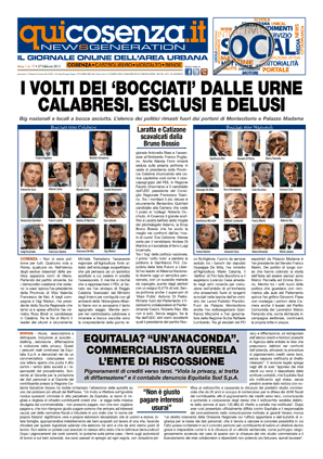 Archivio Storico News Qui Cosenza Primo Piano Anno 1 nr. 17 Pubblicato 13 anni fa il 27 Febbraio, 2013 Di Redazione Argomenti correlati: Prossimo Svizzera: sparatoria in fabbrica, 3 morti Non perdere Avviata indagine su parchi eolici Redazione Pubblicità Pubblicità . CategorieArea Urbana22979Calabria37866Ionio3834Italia8098Provincia20074Tirreno3017 Ultimi Di tendenza Video Calabria4 ore fa Grave incidente sulla A2: quattro auto coinvolte e un ferito. Autostrada chiusa, 6 chilometri di code Università6 ore fa Unical, si insedia il nuovo rettore Gianluigi Greco: il più giovane dopo Andreatta Calabria7 ore fa La tragedia del Monte Covello: 48 anni fa la morte di sei carabinieri in missione Ionio7 ore fa Aeroporto e ferrovia veloce: l’appello dei sindaci di Trebisacce, Cassano e Castrovillari Calabria7 ore fa Dal bullismo alla forza della musica. Anna La Croce, 18 anni, è la più giovane laureata d’Italia in “Didattica della Musica” Area Urbana7 ore fa FIDAPA Rende, Sandra Nanci è la nuova presidente “Impegno per donne e giovani nel segno della continuità” Area Urbana4 settimane fa Inquinamento a Rende: come sono “scomparsi” i laghi della Legnochimica – VIDEO Area Urbana4 settimane fa Straordinario intervento endovascolare all’Annunziata, salvato un 20enne. La mamma «è vivo grazie a loro» Italia3 settimane fa Sicurezza stradale, esposto delle associazioni Vittime della Strada: «segnalateci i pericoli, interverremo subito» Provincia2 settimane fa Allerta arancione in Calabria. Scuole chiuse a Cosenza Rende, Montalto e altri comuni del Cosentino – ELENCO Area Urbana1 settimana fa Giovane influencer di Cosenza guadagna oltre 200mila euro in due anni, ma non li dichiara al Fisco Cronaca3 settimane fa Grave incidente ad Amendolara, auto precipita in un dirupo: tre feriti gravi Calabria16 ore fa Incendio in un capannone agricolo: morti alcuni animali, due persone lievemente ustionate Area Urbana18 ore fa Cosenza, Paolini: “Italia–Irlanda U18, il rugby che unisce due popoli” Calabria1 giorno fa Corruzione, appalti e gestione illecita di fondi pubblici. Indagate 15 persone, anche il sindaco di Cotronei Calabria2 giorni fa Record di reati in una sola notte, 27 tra furti e incendi: arrestato un diciassettenne Calabria2 giorni fa Elisabetta Gregoraci sul caso del padre Mario: “Rosita Gentile, mai offesa né emarginata” Area Urbana3 giorni fa Cosenza: proclamati i 14 consiglieri regionali della Circoscrizione Nord Social 96,533 MI PIACE 2,087 SEGUICI 2,816 SEGUICI 2,831 SEGUICI 2,910 ISCRIVITI