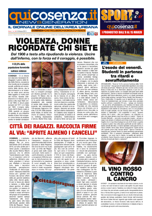 Archivio Storico News Qui Cosenza Primo Piano Anno 1 nr. 24 Pubblicato 13 anni fa il 8 Marzo, 2013 Di Redazione Argomenti correlati: Prossimo Rubata la lapide della tomba segreta di Freddie Mercury a Londra Non perdere Gagliardi pronto a conquistare Sky. In dieci episodi Redazione Pubblicità Pubblicità . CategorieArea Urbana22979Calabria37866Ionio3834Italia8098Provincia20074Tirreno3017 Ultimi Di tendenza Video Calabria6 ore fa Grave incidente sulla A2: quattro auto coinvolte e un ferito. Autostrada chiusa, 6 chilometri di code Università9 ore fa Unical, si insedia il nuovo rettore Gianluigi Greco: il più giovane dopo Andreatta Calabria9 ore fa La tragedia del Monte Covello: 48 anni fa la morte di sei carabinieri in missione Ionio9 ore fa Aeroporto e ferrovia veloce: l’appello dei sindaci di Trebisacce, Cassano e Castrovillari Calabria10 ore fa Dal bullismo alla forza della musica. Anna La Croce, 18 anni, è la più giovane laureata d’Italia in “Didattica della Musica” Area Urbana10 ore fa FIDAPA Rende, Sandra Nanci è la nuova presidente “Impegno per donne e giovani nel segno della continuità” Area Urbana4 settimane fa Inquinamento a Rende: come sono “scomparsi” i laghi della Legnochimica – VIDEO Area Urbana4 settimane fa Straordinario intervento endovascolare all’Annunziata, salvato un 20enne. La mamma «è vivo grazie a loro» Italia3 settimane fa Sicurezza stradale, esposto delle associazioni Vittime della Strada: «segnalateci i pericoli, interverremo subito» Provincia2 settimane fa Allerta arancione in Calabria. Scuole chiuse a Cosenza Rende, Montalto e altri comuni del Cosentino – ELENCO Area Urbana1 settimana fa Giovane influencer di Cosenza guadagna oltre 200mila euro in due anni, ma non li dichiara al Fisco Cronaca3 settimane fa Grave incidente ad Amendolara, auto precipita in un dirupo: tre feriti gravi Calabria18 ore fa Incendio in un capannone agricolo: morti alcuni animali, due persone lievemente ustionate Area Urbana20 ore fa Cosenza, Paolini: “Italia–Irlanda U18, il rugby che unisce due popoli” Calabria2 giorni fa Corruzione, appalti e gestione illecita di fondi pubblici. Indagate 15 persone, anche il sindaco di Cotronei Calabria2 giorni fa Record di reati in una sola notte, 27 tra furti e incendi: arrestato un diciassettenne Calabria2 giorni fa Elisabetta Gregoraci sul caso del padre Mario: “Rosita Gentile, mai offesa né emarginata” Area Urbana3 giorni fa Cosenza: proclamati i 14 consiglieri regionali della Circoscrizione Nord Social 96,548 MI PIACE 2,087 SEGUICI 2,816 SEGUICI 2,831 SEGUICI 2,910 ISCRIVITI