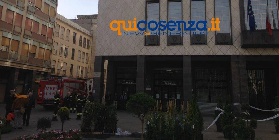 Un pezzo di lastra esterna dei finestroni di Palazzo dei Bruzi ha ceduto finendo nella piazza. Immediato l’intervento dei vigili del fuoco di Cosenza
