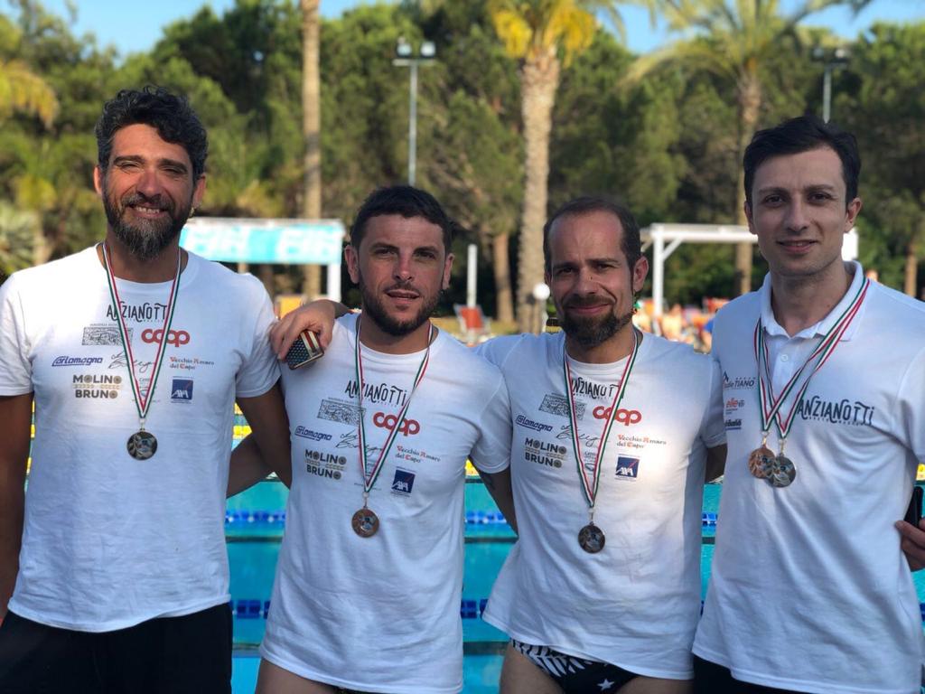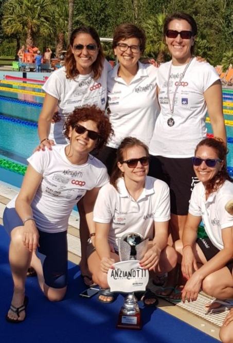 Sono ben 39 le medaglie conquistate dagli Anzianotti: 19 ori, 14 argenti e 6 bronzi. Ma oltre a fare incetta di medaglie, la squadra porta a casa ancora una volta anche tanti record. Serena Cribari nella categoria m30 ha battuto il record con un tempo di 1.27.9 nei 100 dorso, così come Marco Allori nella m35 con un tempo di 2.55.48 nei 200 dorso. Record anche per Giulia Guido nella categoria m45 con un tempo di 1.48.81 e doppietta per Vincenza Rossi, categoria m60 che nei 50 delfino e nei 100 stile ha concluso la cara con un tempo di 48.89 nel primo caso e 1.34.89 nel secondo. Anche nelle staffette, tutte molto entusiasmanti, gli Anzianotti hanno battuto qualche record: nella 4×50 mista femminile 160-199, Cribari, Guido, Rossi e Guzzo ne sono uscite vincitrici con un tempo di 2.55.48. E nella staffetta 4×50 mista maschile 100-119 sono stati invece Verre, De Maria, Mazzuca e Pagliaro a battere il record con il tempo di 2.17.41.
