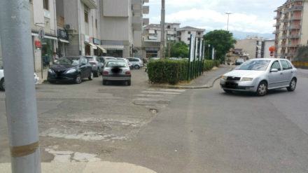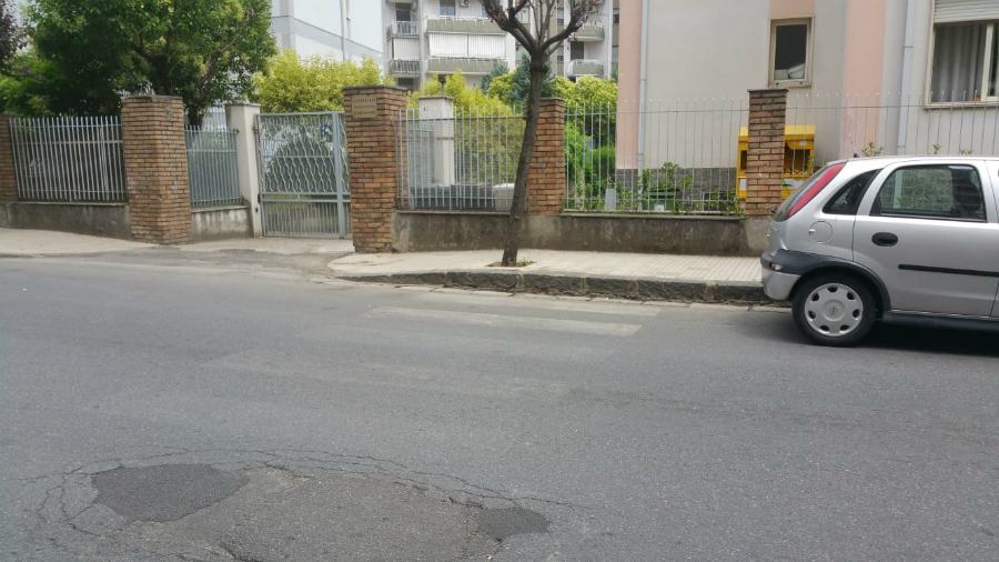 Proseguendo nella “nostra camminata” arriviamo in prossimità della scuola dell’infanzia dove, a guardar bene, ma con molta attenzione, si vede l’ombra di quelle che sarebbero dovute essere le strisce pedonali, posizionate prima e dopo l’ingresso della scuola, ma di fatto invisibili. Tanto che le autovetture parcheggiato a mò di giungla da ambo i lati. Pensiamo per un attimo che i bambini siano costretti ad uscire dalle aule per qualche situazione terza e che debbano abbandonare l’edificio. Se da una parte dovrebbero cercare di salvarsi da situazioni terze, dall’altra potrebbero ritrovarsi investiti dalle auto che “volano” sull’asfalto.