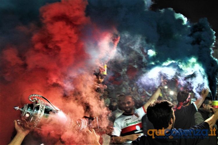 Un trionfo che ha letteralmente mandato in delirio i 10.000 arrivati a Pescara da tutta Italia mentre in città per tutta la notte impazzava la festa tra caroselli d’auto e cori da stadio. Ieri, poi, l‘abbraccio della città alla squadra che dopo essere rientrata da Pescara è salita sul bus scoperto attraversando le vie e i quartieri di tutta Cosenza tra un mare infinto di gente tra il delirio dei tifosi, prima dell’apoteosi finale allo stadio Marulla, dove in oltre 15.000 hanno reso omaggio alla società, allo staff tecnico ma soprattutto a loro, i calciatori rossoblu, gli eroi di questo sogno diventato realtà.