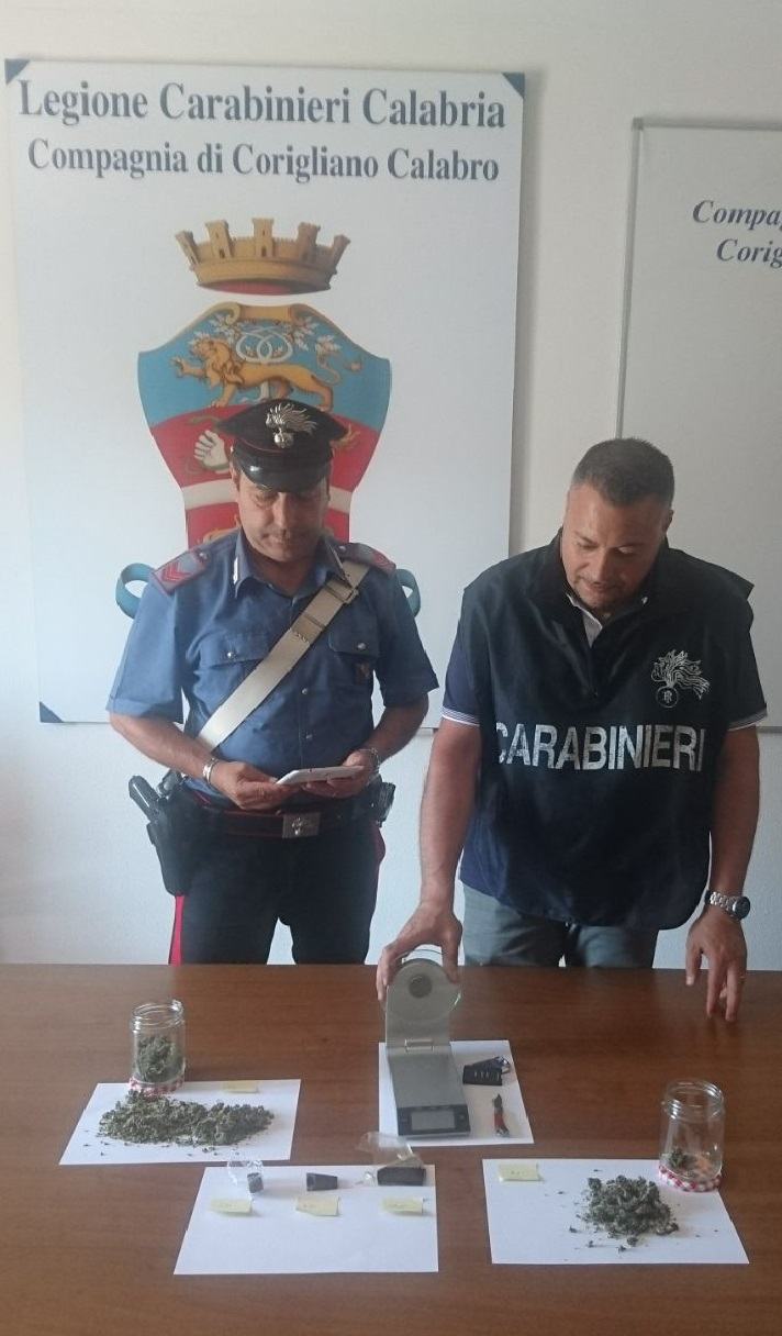 I militari hanno poi proceduto alla perquisizione che ha dato subito esito positivo: all’interno di un mobile della cucina fra i vari barattoli contenenti alimenti, ne sono stati trovati due in vetro pieni di marijuana, per un peso complessivo di circa 35 grammi. In un altro contenitore di plastica c’erano 33 grammi di hashish in tavolette spezzate. Infine in vari cassetti sono stati trovati soldi, denaro contante per circa 3mila euro, in banconote di vario taglio, ritenuto provento dell’attività di spaccio delle sostanze stupefacenti.