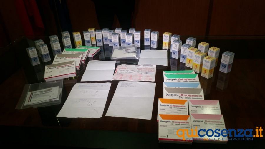 I complessi approfondimenti investigativi hanno consentito di accertare, nell’arco di un anno, un articolato e ben organizzato sistema di procacciamento dei menzionati cerotti da parte degli indagati, i quali, utilizzando ricettari provento di furto perpetrato in Ospedali ed Ambulatori della provincia di Cosenza e diversi timbri contraffatti, recanti i dati identificativi di un medico ormai in pensione o medici inesistenti e quelli di pazienti ignari, della truffa falsificavano le prescrizioni mediche ed acquisivano fraudolentemente, presso farmacie della Provincia di Cosenza (site nei comuni di Cosenza, Calopezzati, Castrovillari, Corigliano-Rossano, Mirto Crosia, Montalto Uffugo e San Marco Argentano) numerosissime confezioni di “Durogesic”.