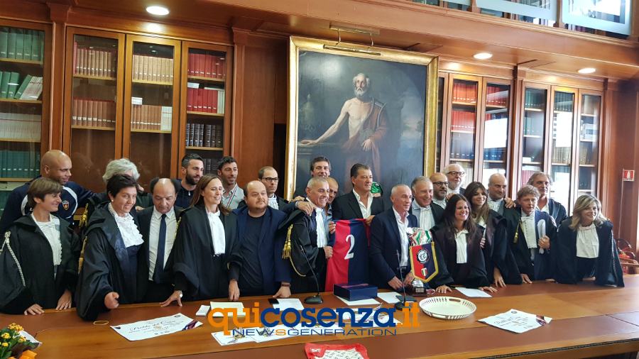 Una cerimonia prestigiosa all’insegna del calcio e del Cosenza quella di oggi, al Tribunale bruzio per celebrare tre eventi a tinte rossoblu. Quello recente di Pescara, con la promozione in serie B omaggiato dalle vecchie glorie della stagione 1987/88 a trent’anni esatti dal salto di categoria targato Di Marzio, fino al trionfo della squadra di calcio forense laureatasi campione d’Italia