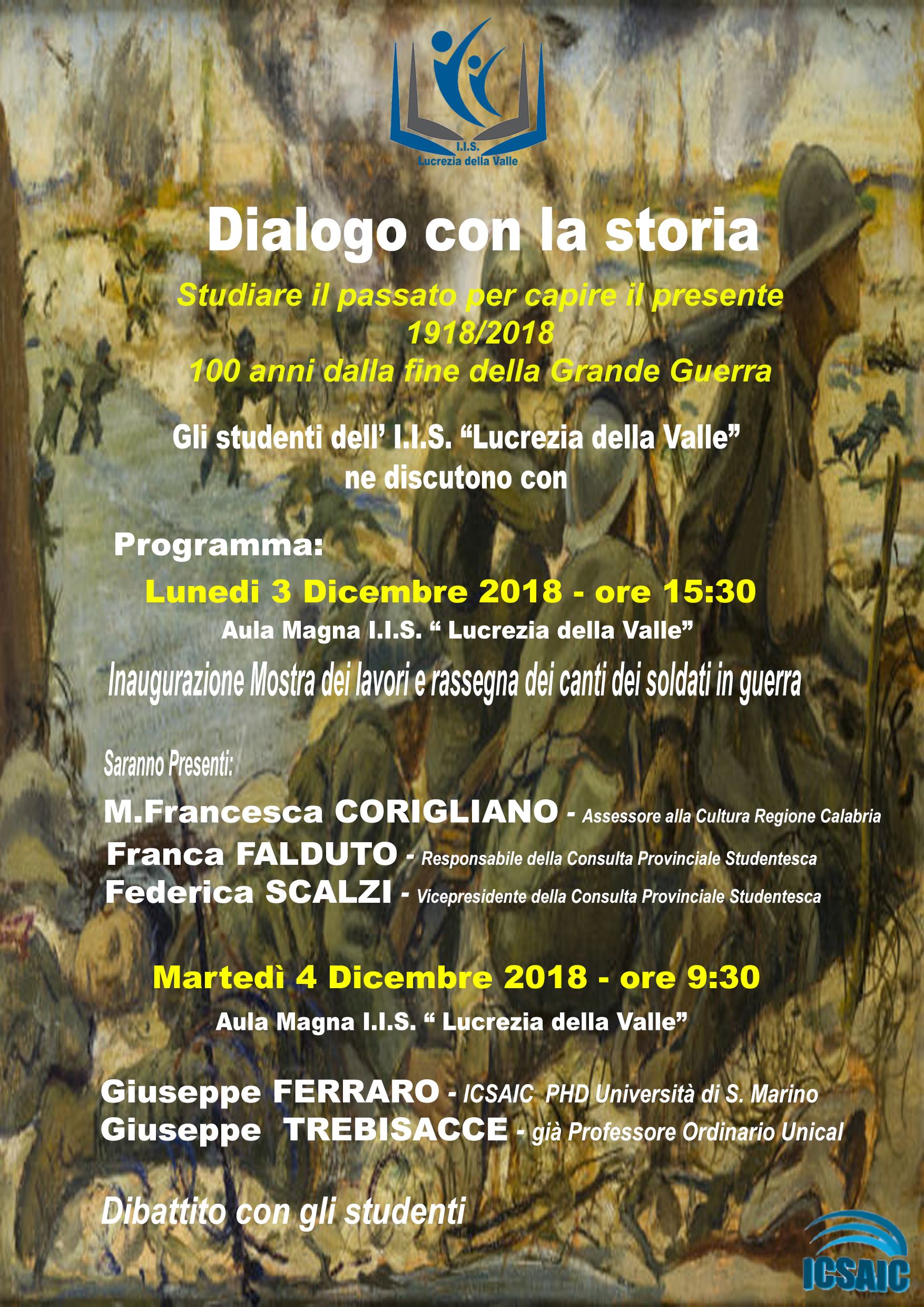 COSENZA – “Dialogo con la storia. Studiare il passato per capire il presente. 1918-2018, 100 anni dalla fine della Grande Guerra” è il tema dei due giorni di riflessione che domani e il 4 dicembre vedrà la partecipazione degli studenti delle quinte dell’I.I.S. “Lucrezia della Valle” di Cosenza proporranno a tutti coloro che vorranno intervenire, nell’Aula Magna della scuola di Piazza Amendola, al termine di uno specifico percorso dedicato al centenario della conclusione della Prima Guerra Mondiale.