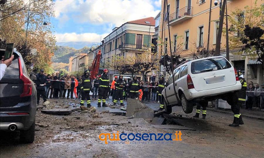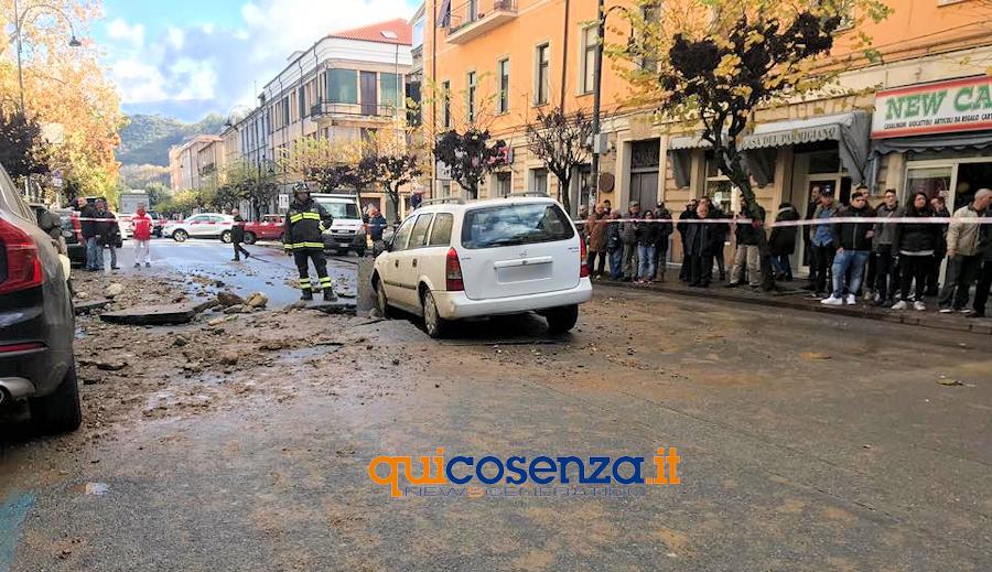 (FOTO – VIDEO) Cosenza, scoppia condotta su Corso Umberto: auto sprofonda in un cratere