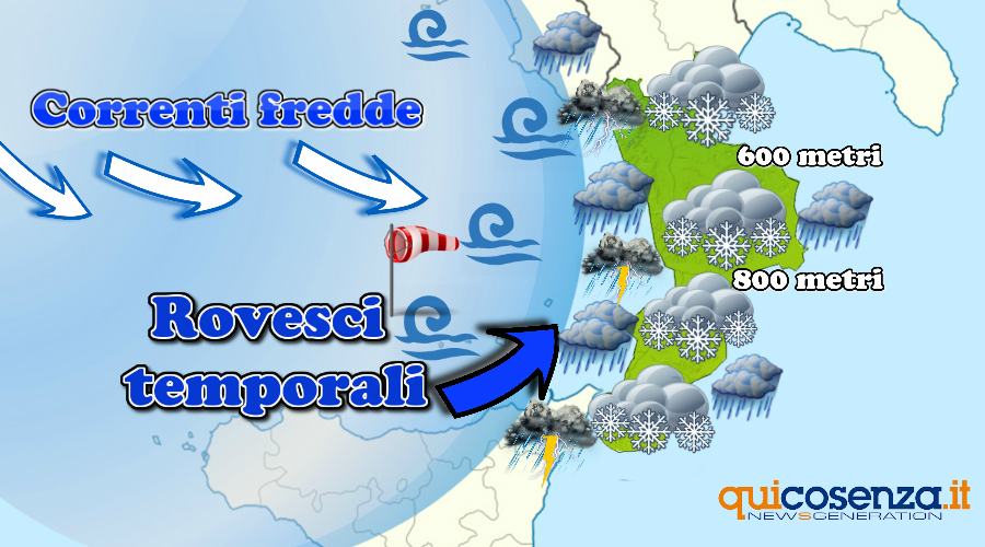Meteo Cosenza, focus maltempo. Dalla sera piogge, rovesci e nevicate fino in collina