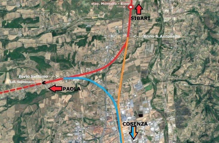 Partito dall’importante nodo jonico, infatti, il convoglio transiterebbe dalle stazioni (ed ex stazioni) di Cassano allo Ionio, Spezzano Albanese Terme, Tarsia, San Marco-Roggiano, Mongrassano-Cervicati, Torano-Lattarico, Acri-Bisignano-Luzzi, fino ad arrivare nel Posto di Movimento di Montalto – Rose. Dopo circa 1 chilometro da questo punto, si trova la diramazione di Bivio Sant’Antonello che conduce sulla sinistra a Castiglione Cosentino e Cosenza, sulla destra direttamente a Paola. Proseguendo, il treno incontrerebbe dopo circa un altro chilometro, il Bivio Settimo, ovvero il punto in cui si congiunge la linea ferroviaria proveniente da Cosenza, ed entrando, di fatto, sulla linea Cosenza – Paola, proseguendo all’interno della Galleria Santomarco.