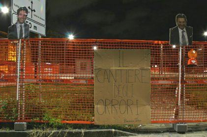 Allora ho deciso di scendere dalla plurisecolare poltrona e venire in mezzo a voi. Anch’io voglio dire la mia. Ho notato che l’unico linguaggio possibile ormai è quello dei musei. Ci sono musei digitali, sul web, dove tutti mettono in mostra la parte superficiale di sé. Musei della cioccolata ambulante, deprimenti notti bianche del fitness, mostre permanenti di artisti improbabili catapultati nei loculi del parco fluviale. Allora ho deciso di regalarvelo anch’io un bel museo, dedicato ai mostri di cui non riuscite a liberarvi da decenni, quelli che in cambio dei vostri voti elargiscono favori e lavori precari ai vostri figli, quelli che saccheggiano i fondi pubblici, gestiscono gli appalti, succhiano il sangue della povera gente. Stamani all’alba ho allestito il nuovo museo. Si chiamerà “Cantiere degli orrori”. Ho deciso di realizzarlo nel luogo che meglio di ogni altro rappresenta l’inutilità, il raggiro, la paralisi dei vostri corpi: l’ex Viale Parco. Ma questo è solo l’inizio. Continuerò a scendere dalla mia poltrona di bronzo, quando nessuno se ne accorge e la città dorme. Perché la Natura obbedisce solo alle proprie leggi. Ma a volte anche gli elementi naturali, di fronte a tanto degrado, si incazzano».