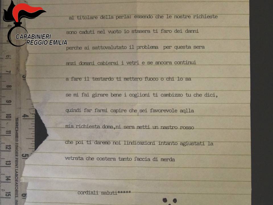 REGGIO EMILIA – Minacce esplicite e richieste scritte in modo sgrammaticato, a macchina, su carta a righe. Sono i ‘pizzini’ che carabinieri e polizia di Reggio Emilia hanno ritrovato nei quattro ristoranti di città e provincia finiti nel mirino di estorsori che, con modalità inquietanti, nelle scorse settimane hanno chiesto ai titolari dei locali mille euro per continuare la loro attività. In due casi erano stati esplosi colpi di pistola contro le vetrine durante la notte. Per questi episodi, i carabinieri e la polizia, hanno fermato sabato mattina tre persone: Mario, Cosimo e Michele Amato, figli di Francesco Amato, condannato nel processo Aemilia a 19 anni e un mese di carcere e protagonista il 5 novembre del sequestro alle poste di Pieve Modolena. Le forze dell’ordine hanno identificato i tre grazie ad appostamenti fuori dai locali, con i militari dell’arma di Cadelbosco Sopra che li hanno riconosciuti a bordo dei mezzi che utilizzavano per effettuare sopralluoghi intorno alle pizzerie. All’interno dell’abitazione degli Amato a Cavazzoli, frazione di Reggio Emilia, durante una perquisizione i carabinieri hanno trovato una macchina da scrivere, che potrebbe essere quella utilizzata per scrivere i bigliettini. Ritrovate anche l’auto e le moto usate in occasione degli atti intimidatori effettuati con le esplosioni di armi da fuoco, alcuni vestiti e un giubbotto antiproiettile, che ha destato preoccupazione negli inquirenti.