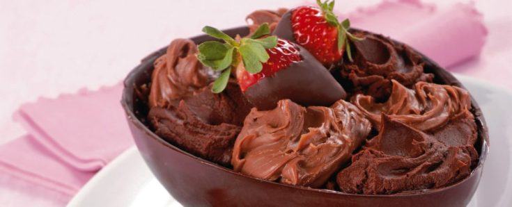 - Farcisci il mezzo uovo di cioccolato con le due creme alternandole a cucchiaiate, guarnisci con le fragole. Servi in tavola il tuo guscio bigusto con fragole glassate.