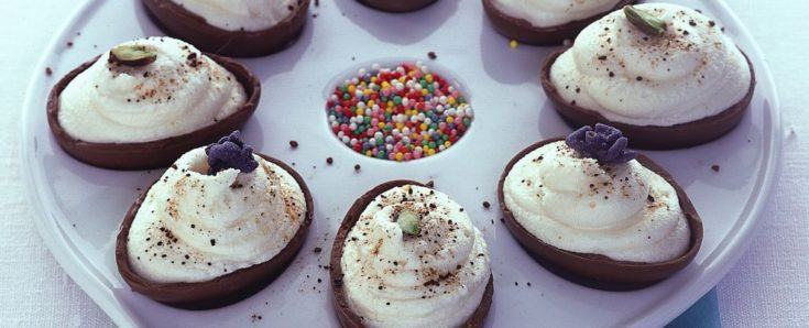 - Spolverizza gli ovetti con mousse bianca con il caffè liofilizzato e poi mettili in frigorifero per almeno 4 ore. Al momento di servire in un piatto portauova, decora con gli zuccherini colorati, i pistacchi, le violette candite.