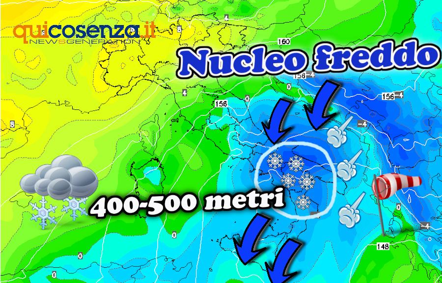Meteo Cosenza, arriva un nuovo nucleo freddo. Altra neve sui 400-500 metri