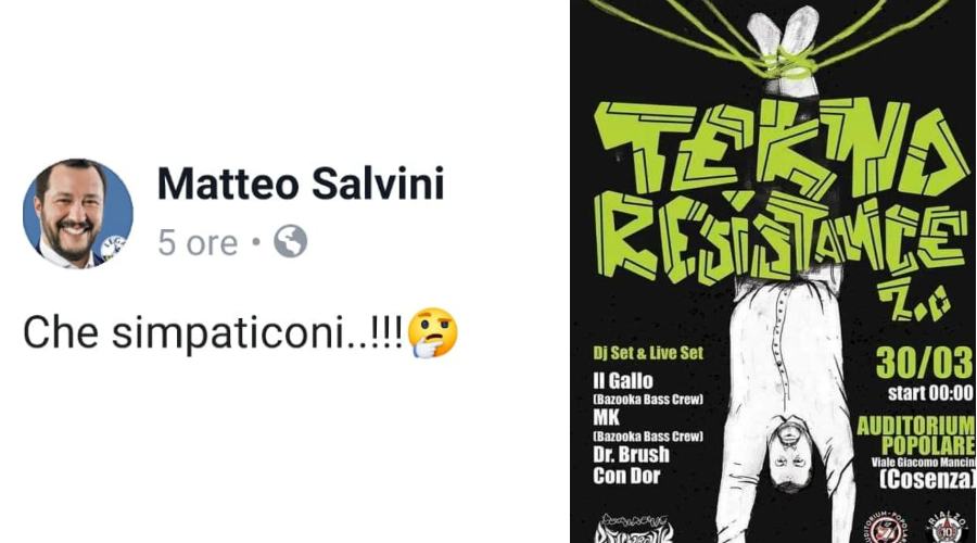 COSENZA – La locandina è quella di un djset in programma il 30 marzo prossimo all’Auditorium popolare di Viale Giacomo Mancini il 30 marzo. La serata si chiama “Tekno resistance” ma quello che ha colpito il vicepremier è l’immagine del manifesto: un disegno di Matteo Salvini appeso a testa in giù legato per i piedi. La locandina è stata postata proprio da Salvini con tanto di commento: «Che simpaticoni..!!!». Al suo tweet seguono ovviamente numerosi commenti, molti dei quali hanno ritenuto di cattivo gusto la locandina.