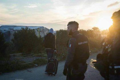 In realtà erano molti di più gli agenti impiegati nell’attività di sgombero. C’è stato un dispiegamento di forze e mezzi davvero notevole, c’erano anche due elicotteri che sorvolavano la zona. Probabilmente si aspettavano una qualsiasi forma di resistenza da parte dei lavoratori migranti, ma è stato tutto davvero tranquillo. Era prevista un’area riservata a giornalisti ed operatori tv, ma onestamente volevo approfondire un po’ di più la situazione, dall’interno, quindi in qualche modo sono riuscito ad entrare.