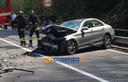SAN FILI (CS) – Incidente nella tarda mattinata di oggi, intorno alle 11:30, sulla statale 107 nel Comune di San Fili. Per cause ancora in corso d’accertamento due vetture si sono scontrate frontalmente. Uno dei due veicoli, a seguito dell’impatto è precipitato in una scarpata. La conducente è finita in un burrone con la sua Fiat 500 dove i Vigili del Fuoco coadiuvati da un’autogru hanno operato per estrarla dalle lamiere. Feriti anche i due passeggeri che viaggiavano sull’altro mezzo, una Mercedes.  Sul posto sono intervenuti i sanitari del 118 che hanno trasportato d’urgenza la signora, ancora vigile e cosciente, all’Ospedale di Cosenza con l’elisoccorso. Per consentirne l’atterraggio sono il traffico è stato deviato al chilometro 15.500 nel Comune di San Fili e al chilometro 18.300 nel Comune di Rende. Il tratto interessato dall’incidente è stato temporaneamente interdetto al transito, in entrambe le direzioni all’altezza del chilometro 16,400 in attesa della rimozione dei veicoli dalla carreggiata. Il personale Anas ha lavorato in loco per ripristinare la viabilità. Il traffico è stato sbloccato alle 14:30.