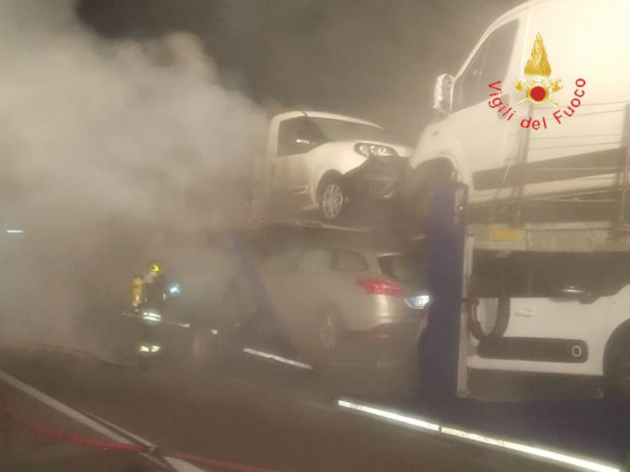Il mezzo era in transito al momento dell’incendio. Le cause sono accidentali. L’autista è riuscito ad abbandonare la cabina senza riportare alcun danno. La motrice e due delle quattro autovetture trasportate sono andate completamente distrutte. Parziali danni ad altre due vetture mentre intatte le rimanenti quattro.