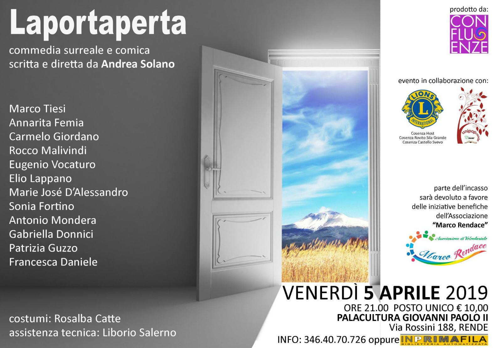 RENDE – Lo spettacolo di beneficenza è in favore dell’associazione di volontariato Marco Rendace, che offre la sua importante attività solidaristica all’interno del reparto di Pediatria dell’Ospedale Annunziata di Cosenza. L’evento, che si terrà venerdì 5 aprile, alle ore 21, presso il Palacultura Giovanni Paolo II di Rende. Si tratta di uno spettacolo comico surreale, scritto e diretto da Andrea Solano, dal titolo “Laportaperta”, interpretato dall’affiatata e talentuosa compagnia teatrale Confluenze nella quale spiccano nomi noti della scena calabrese (tra tutti, i più conosciuti Marco Tiesi e Carmelo Giordano). A qualche giorno dalla rappresentazione, la presidente Francesca Daniele ha annunciato che si è quasi giunti al sold out per uno spettacolo che è sicuramente molto atteso dagli amanti del teatro amatoriale, visti i precedenti successi ottenuti dagli attori del gruppo teatrale di Confluenze.