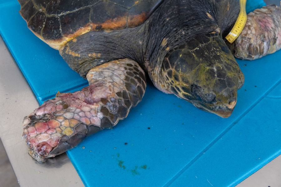Ricordiamo che, al momento del ritrovamento, la tartaruga era avvolta in tantissima lenza in nylon con entrambe le pinne anteriori, ad un cerchione di bicicletta e ad un galleggiante in sughero che, ormai imbevuto di acqua, raggiungeva un notevole peso. Tutto questo materiale veniva trainato a nuoto dalla povera tartaruga, mentre la lenza provocava una stretta sempre più energica alle sue pinne anteriori, fino a lesionarle in maniera tanto grave da generare la cancrena ad entrambi gli arti. Una trappola mortale che non le ha lasciato scampo.