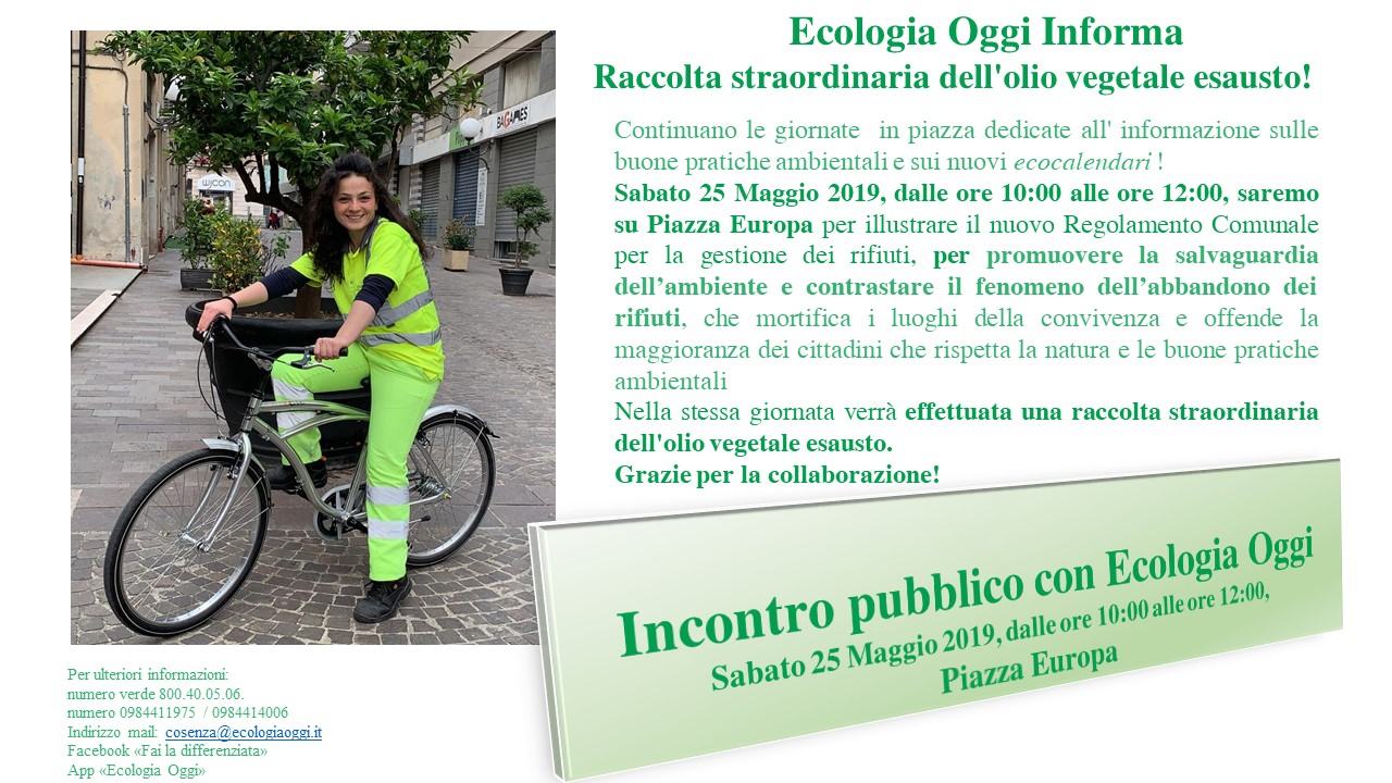 COSENZA – Il prossimo appuntamento è per domani, sabato 25 maggio dalle 10:00 alle 12:00, su Piazza Europa. Ecologia Oggi sarà sul posto per illustrare il nuovo Regolamento Comunale per la gestione dei rifiuti, per promuovere la salvaguardia dell’ambiente e contrastare il fenomeno dell’abbandono dei rifiuti che mortifica i luoghi della convivenza e offende la maggioranza dei cittadini che rispetta la natura e le buone pratiche ambientali. Nella stessa giornata verrà effettuata una raccolta straordinaria dell’olio vegetale esausto.