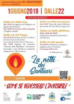 L’ appuntamento sarà alle 21,45 di oggi, sul sagrato dell’antico Santuario della Riforma. Dopo l’accensione della lampada Locus Lucis inizierà un itinerario tra i luoghi del Santuario: dalla storica Biblioteca del Convento al Chiostro della “Maddalena” recentemente restaurato, alla riscoperta della storia, dell’arte e della devozione di uno tra i luoghi sacri più cari per la popolazione cosentina e dei centri vicini alla città capoluogo. Dalle 22,00 alla mezzanotte, il percorso sarà animato da artisti e musicisti che contribuiranno a rendere ancor più manifesto, attraverso il loro talento, il senso del vedere ciò che è invisibile, considerato che il motivo conduttore della “Notte dei Santuari” in tutta Italia è proprio “Come se vedessero l’invisibile”. La conclusione della manifestazione è prevista dopo la mezzanotte.