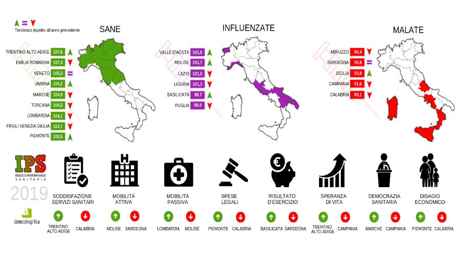 È il Trentino Alto Adige, la regione in testa per efficienza del sistema sanitario italiano, strappando la prima posizione all’Emilia Romagna, mentre Calabria, Campania e Sicilia si collocano in coda tra le realtà “più malate” del paese. In totale sono nove le realtà territoriali definite “sane”, sei le aree “influenzate” e cinque le regioni “malate”. Al Sud la migliore perfomance spetta al Molise e alla Basilicata che migliorano la loro “condizione” rispetto all’anno precedente.Classifica “IPS 2019”: Trentino Alto Adige, Emilia Romagna e Veneto sul podio. In coda Calabria, Campania e Sicilia. Si gioca interamente nell’area del centro-nord la contesa sulle posizioni migliori quali sistemi sanitari più “sani” d’Italia: sei appannaggio del realtà regionali del Nord e le rimanenti tre al Centro.