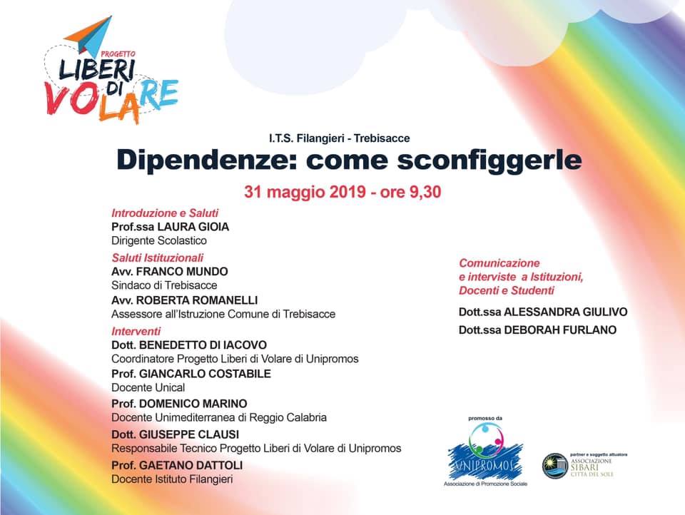 TREBISACCE (CS) – Primo appuntamento all’Istituto tecnico statale “Filangieri” di Trebisacce la per il progetto “Liberi di volare” di Unipromos. La finalità dell’iniziativa è formare e informare i ragazzi per prevenire le dipendenze patologiche e i rischi correlati, attraverso l’introduzione di nuove strategie di peer education. Droga, alcol, bullismo e cyberbullismo, ludopatia, solitudine virtuale sono i cancri che affliggono in particolar modo la gioventù che potrebbe intraprendere comportamenti a rischio. L’obiettivo è creare un comune cammino verso la prevenzione sull’uso e sull’abuso di sostanze psicoattive e di contrasto a modelli di comportamento patologici, per conoscere le loro paure ed affrontarle.