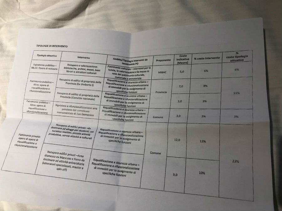 Giova ricordare che l’Esecutivo Occhiuto ha “una visione complessiva su come riqualificare in maniera davvero incisiva il Centro storico di Cosenza”. Una visione che identifica nell’arco di 15 anni, 8 dei quali sono già trascorsi, un percorso con proposte precise. “A suo tempo – aggiunge Occhiuto – avevamo  presentato al ministro Bonisoli una ripartizione mirata dei 90 milioni di euro del Cipe su idee e progetti concreti. Il Comune di Cosenza ha redatto infatti una proposta operativa perfettamente dettagliata sui 20 alloggi da espropriare e recuperare a seguito di inampimento dei proprietari, sul rifacimento della rete idrica e fognaria (6milioni di euro), sui fondi che servono ad esempio per altri sotto-servizi (2milioni) e, ancora, sull’accessibilità facilitata (12 milioni di euro), sulla riqualificazione degli spazi liberi aperti e sul verde (5milioni di euro), sugli alloggi di proprietà della Provincia da destinare a facoltà universitarie (10 milioni di euro), sugli immobili di proprietà pubblica (25milioni di euro), da destinare ad alloggi per 2/3mila studenti e giovani coppie portando così nuove persone a vivere nel Centro storico”.
