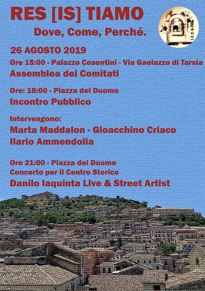 COSENZA – Lunedì 26 agosto sarà una giornata dedicata all’incontro e al confronto tra diverse realtà attive in provincia di Cosenza, impegnate contro il degrado e lo spopolamento della Calabria. Un evento che inizierà a partire dalle 15:00 con l’assemblea dei comitati presso palazzo Cosentini in via Galeazzo di Tarsia. A seguire, dalle 18:00 in Piazza Duomo, incontro pubblico con: Ilario Ammendolia, scrittore ed ex sindaco di Caulonia, che offre una lettura apparentemente provocatoria in merito al degrado della Calabria riassumibile nel titolo stesso della sua ultima opera “La ‘ndrangheta come alibi”. Un alibi ampiamente abusato e strumentalizzato negli ultimi 40 anni da una politica stracciona, quasi sempre con il cappello in mano, ma soprattutto incapace di amare la nostra terra e la nostra gente riducendola al triste scenario che dal Pollino all’Aspromonte è sotto gli occhi di tutti; Gioacchino Criaco, scrittore e intellettuale aspromontano, che porta in giro per il mondo la sua rabbia verso gli invasori che hanno colonizzato e saccheggiato una terra che ha conosciuto ben altra ricchezza umana, culturale ed economica. Al tempo stesso, Criaco, invita ad invertire la rotta attraverso la cultura della “Restanza” da assumere, quasi, a manifesto politico contro l’inesorabile spopolamento e il conseguente degrado. Res(is)tiamo, sì. Ma dove, come, perché. Marta Maddalon, docente Unical e attivista del Comitato Piazza Piccola, padana di nascita, naturalizzata calabrese, traccerà una sintesi tra il pensiero romantico della Calabria che fu e le contraddizioni attuali. A chiudere la serata, sempre in piazza Duomo, alle 21:00 aperitivo e concerto per il centro storico di Danilo Iaquinta, tenore in fuga dalla nostra terra, vive e lavora a Milano.