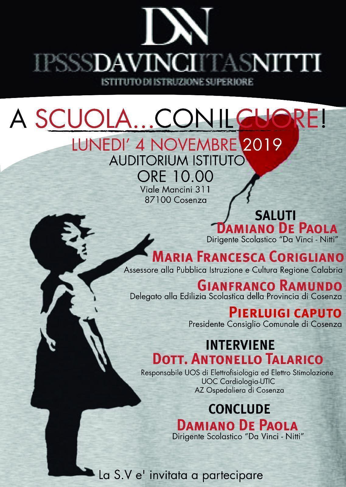 COSENZA – Si intitola “A Scuola… con il Cuore” ed è un’iniziativa promossa dall’istituto di Istruzione Superiore I.P.S.S.S. Da Vinci – I.T.A.S Nitti di Cosenza. L’obiettivo dell’iniziativa in programma lunedì 4 novembre alle ore 10.00 nell’auditorium dell’Istituto in viale Mancini a Cosenza, è il benessere degli studenti, intesi come centralità dell’azione formativa quotidiana.