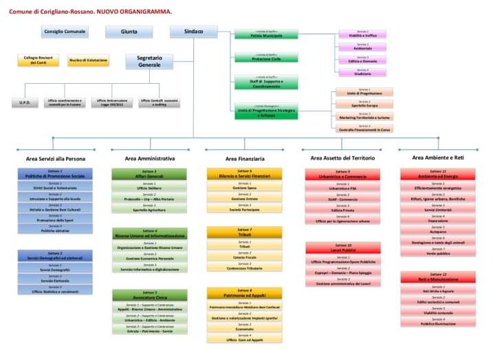 Sono 5 le macro-aree, a loro volta articolate in settori. L’area Servizi alla Persona, con i due settori Politiche di Promozione Sociale e Servizi Demografici ed elettorali. L’Area Amministrativa, di cui faranno parte i settori Affari Generali, Risorse umane ed informatizzazione, Avvocatura Civica. Rientrano nell’Area finanziaria, i settori bilancio e servizi finanziari, Tributi, patrimonio ed appalti. L’Area Assetto del Territorio è articolata in Urbanistica e Commercio e Lavori Pubblici. Soni ricompresi, infine, nell’Area Ambiente e Reti i settori Ambiente ed energia, Reti e Manutenzione.