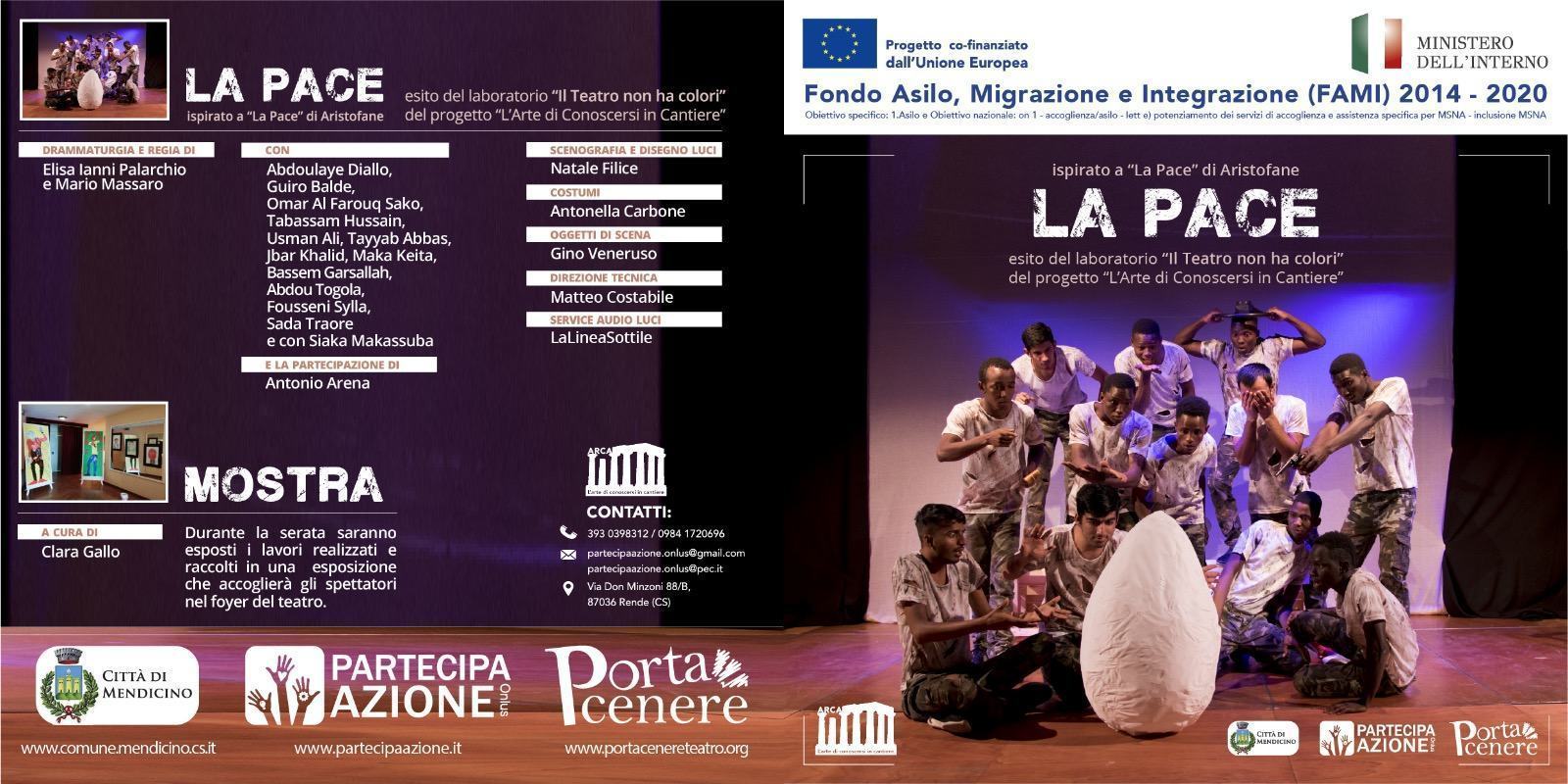 MENDICINO (CS) – Sarà presentato domattina lo spettacolo “La Pace” di Aristofane, in scena il giorno seguente ovvero martedì 12 novembre alle ore 18. La performance teatrale inserita nell’ambito del progetto “L’Arte di Conoscersi in Cantiere” finanziato con risorse del fondo FAMI del Ministero dell’Interno e della Unione Europea realizzato dall’Associazione PartecipaAzione Onlus, di cui è beneficiario il Comune di Mendicino.